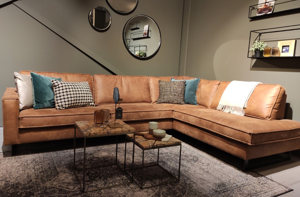 Bijvoorbeeld, een cognackleurige leren bank kan fantastisch worden gecombineerd met olijfgroene kussens en terracotta accentstukken. Dit geeft een gevarieerde, maar samenhangende look die de ruimte tot leven brengt.